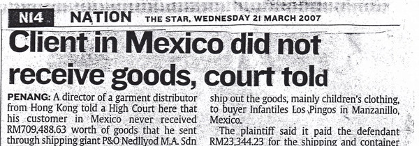 PENANG: A director of a garment distributor from Hong Kong told a High Court here that his customer in Mexico never received RM709,488.63 worth of...