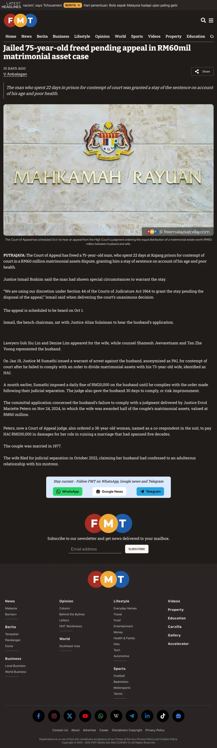 26 Feb Jailed 75-year-old freed pending appeal in RM60mil matrimonial asset case